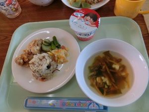 5月誕生会(給食) 平成30年4月25日(水) 4月のお誕生会給食を紹介します♪ 炊き込み御飯 (とっても具だくさん!!) 唐揚げ (ジュ~シィ~♪あっという間に、お皿の上からなくなりました!) 春野菜サラダ (旬の野菜がたっぷり!アスパラもソラマメも、みんな美味しくいただきました♪) なめこ汁 (なめこをツルン♪とお口にいれて♪) ヨーグルト (お腹いっぱいでも、ペロリと食べれる至福の時間♪) たくさんおかわりもして、みんなで美味しく楽しくいただきました!! ごちそうさまでした!!
