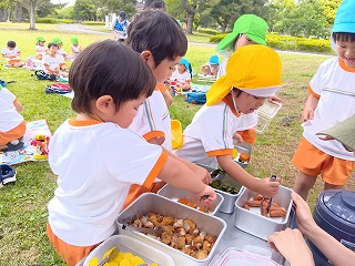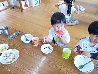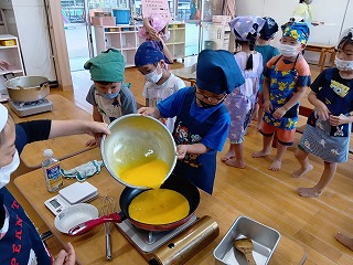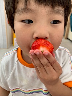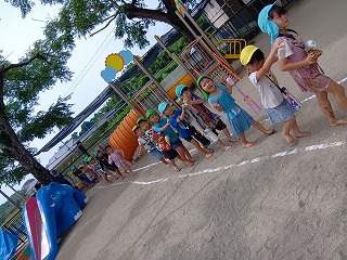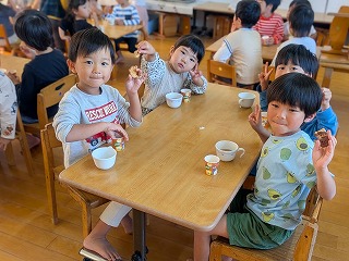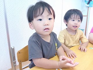 朝早くから、暑い中お外で遊んでいたお友達も、寒天の感触と透き通った涼しげな色合いで
