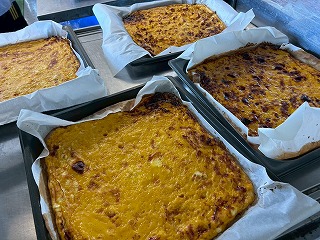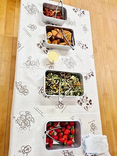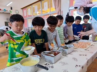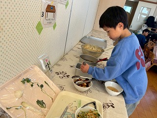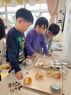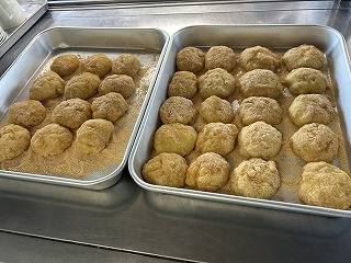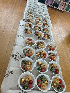 給食の先生の手で、着々と朝ごはんの準備が進んでいます♪
