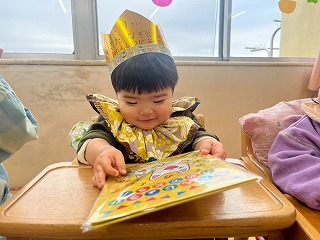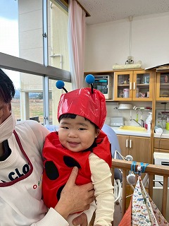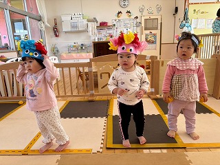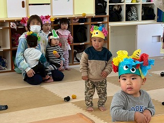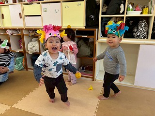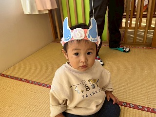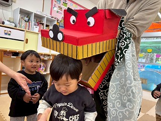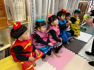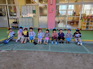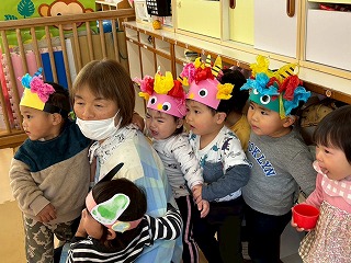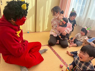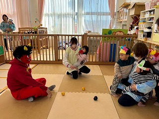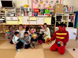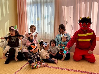 可愛い鬼さんに変身して、節分の豆まきを楽しんでいる、あひる組さんのお部屋♡