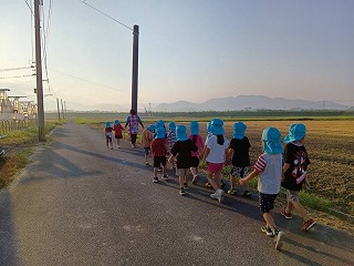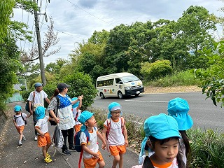 つばめ組のお友達は、昨日の楽しかった思い出話に花を咲かせながら、夏の朝の気持ち良い風を感じつつ歩きます。