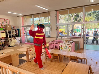 2名の消防隊のお兄さんたちが、お友達を出迎えてくれ
