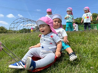 そして、たくさん持参してあったソリを使って、草スキー♪